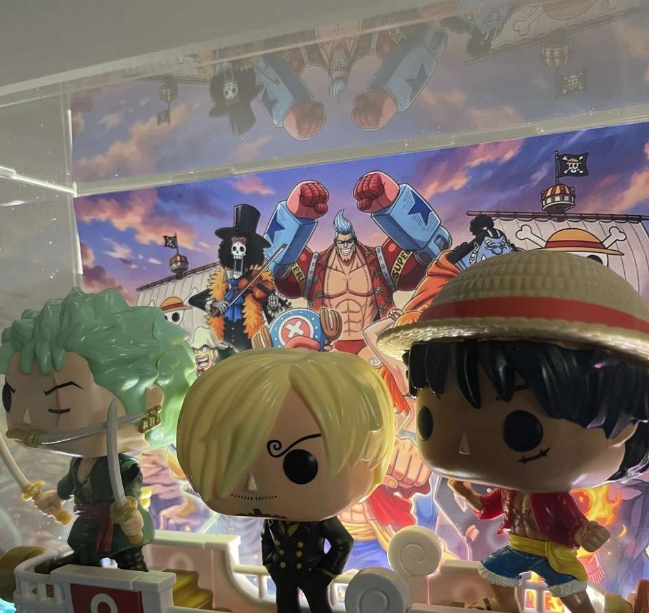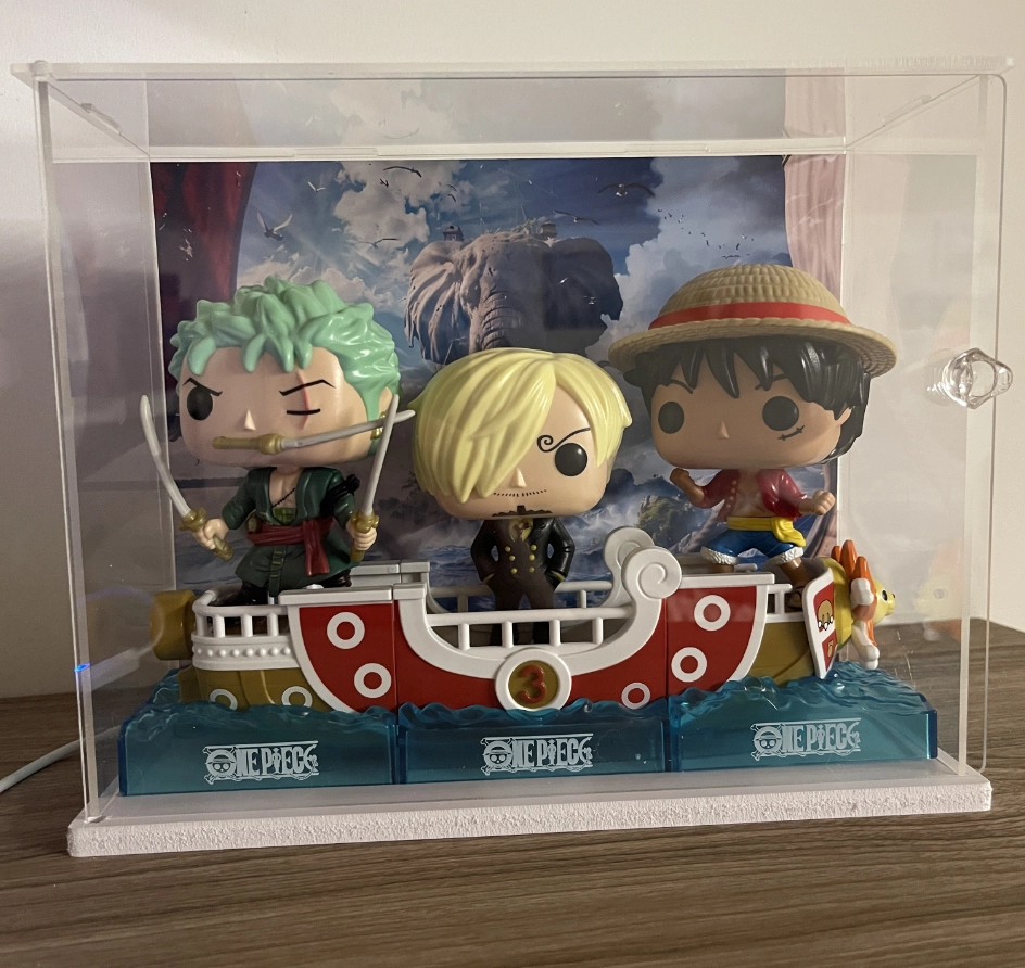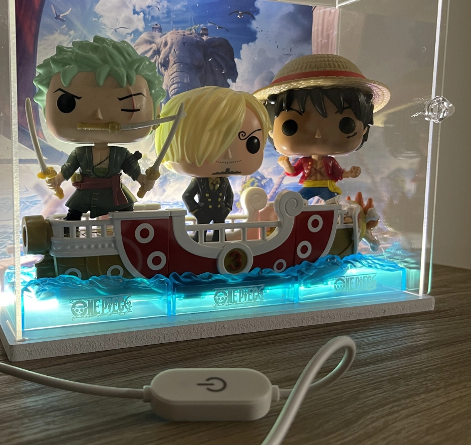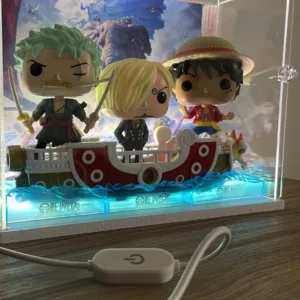 Teca in plexiglass trasparente 25x10x20cm per la tua collezione One Piece. LED integrato nella base, sfondo a scelta tra Zunesha e Ciurma. Pannello apribile. Compatibile con Funko Pop Kinder Joy One Piece.
