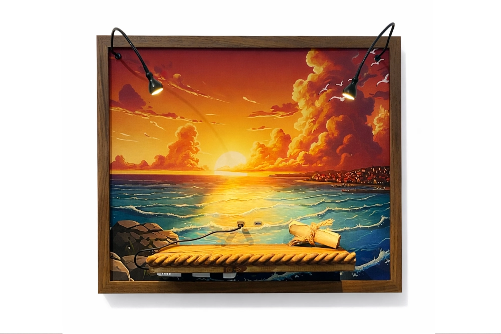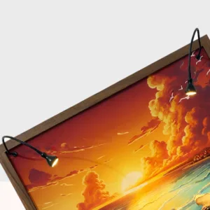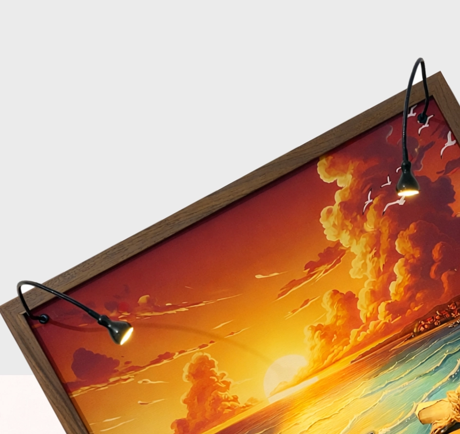 Due faretti a luce calda montati in alto sulla cornice, uno per lato. Orientabili manualmente — puoi puntarli esattamente dove vuoi, su una figura specifica, su un dettaglio dello sfondo, sull’intera scena. L’effetto è quello di una galleria d’arte: ogni pezzo trova la sua luce, ogni figura diventa un’opera da guardare.