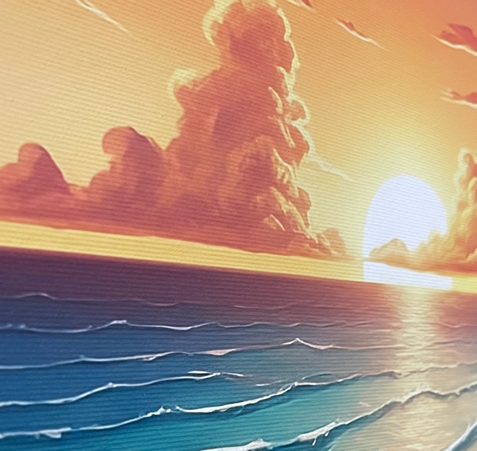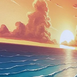 Lo sfondo raffigura un tramonto sul Grand Line — nuvole infuocate di arancio e rosso, il mare mosso, la luce che taglia l’orizzonte. Uno dei visual più iconici dell’universo One Piece, reso con colori saturi e profondi che emergono ancora di più con i faretti accesi. La stampa su tela garantisce una resa cromatica superiore alla stampa digitale e una texture che si percepisce anche da vicino.