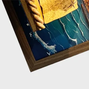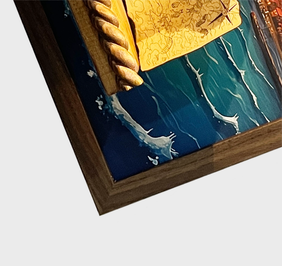 Espositore artigianale 50x40cm in legno noce per la tua collezione One Piece. Sfondo su tela, mensola effetto corda, mappa del tesoro in omaggio. Doppi faretti e modulo audio opzionali. Edizione limitata.