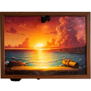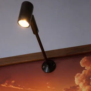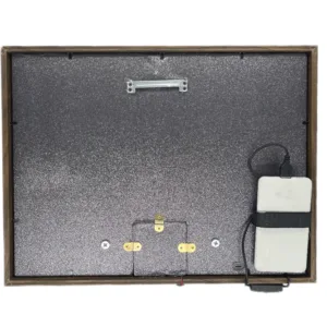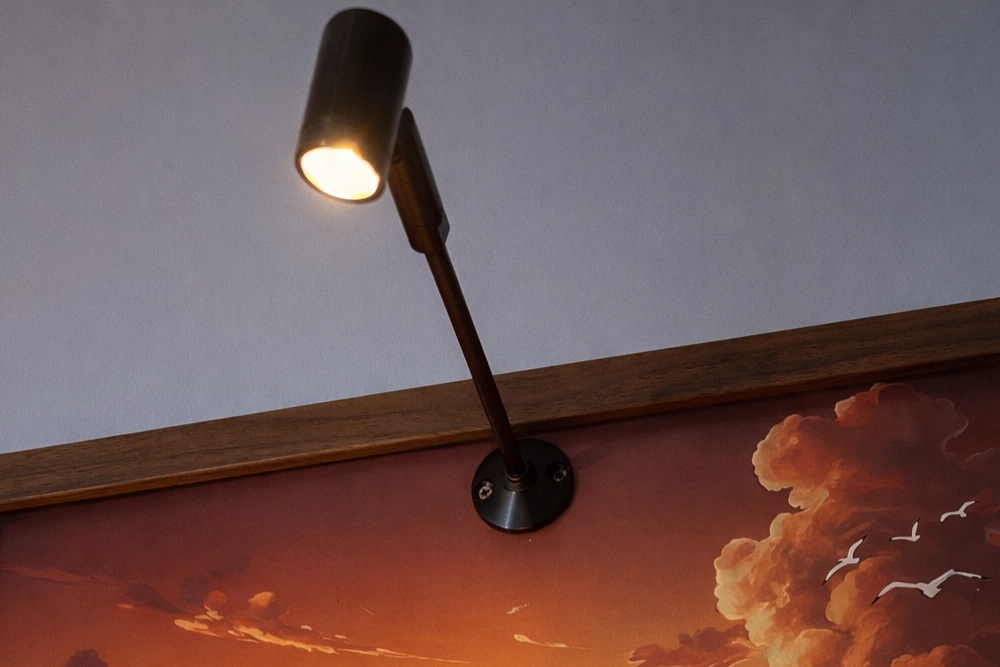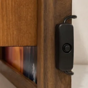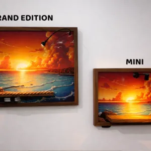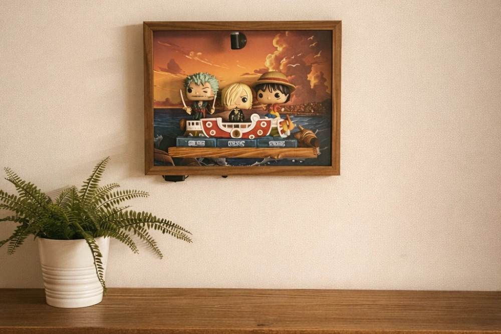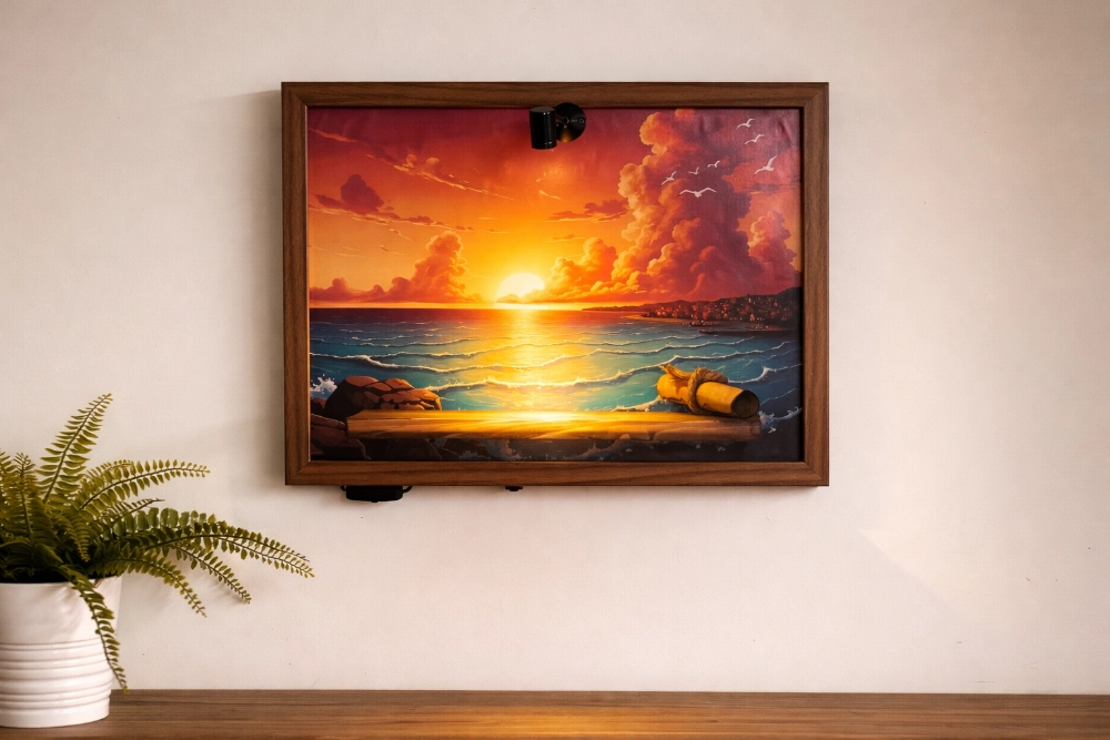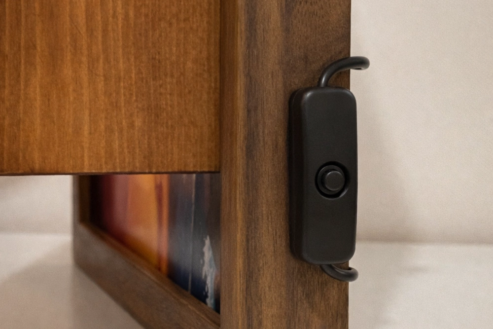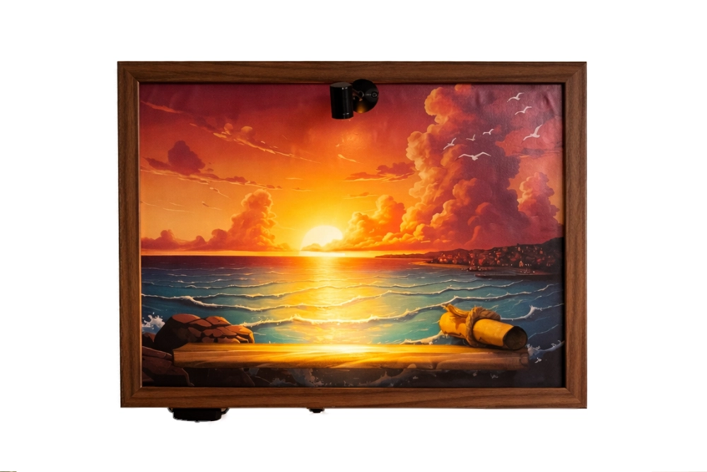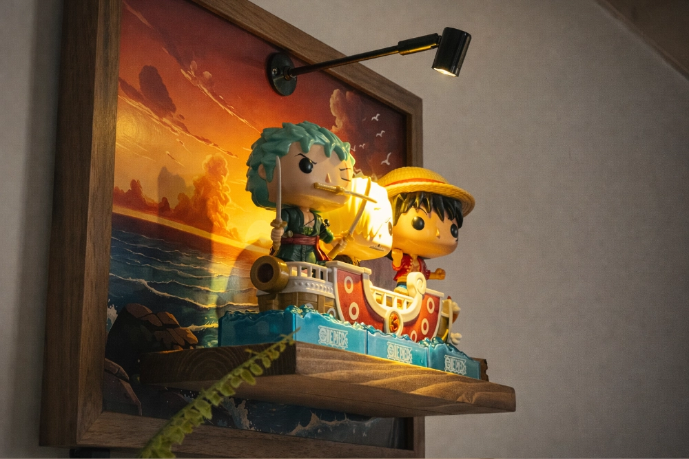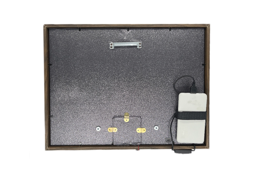 Un faretto a luce calda montato sulla cornice, orientabile manualmente. Puntalo sulla figura che vuoi mettere in risalto — l’effetto cambia completamente rispetto a una luce ambiente generica. Alimentazione tramite powerbank USB (non incluso).