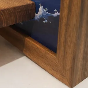 Espositore One Piece 40x30cm in legno noce con sfondo stampato digitale. Formato compatto per scrivania o mensola. Faretto orientabile e modulo audio opzionali. Edizione limitata.