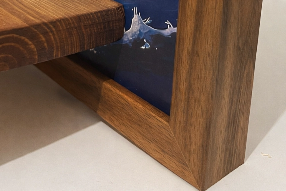 40x30cm in legno noce. Compatta ma non piccola — abbastanza da contenere la collezione della Funko Pop Kinder Gran Sorpresa con il giusto respiro visivo. Il legno noce porta calore naturale e una texture che si percepisce subito al tatto. Ogni cornice ha le sue variazioni naturali:
