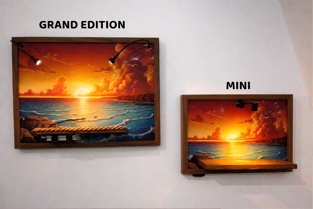 Scegli il Grand Edition se vuoi il massimo — sfondo su tela, doppi faretti, mensola effetto corda. Se vuoi che l’espositore sia il centro visivo della stanza, non solo un dettaglio.